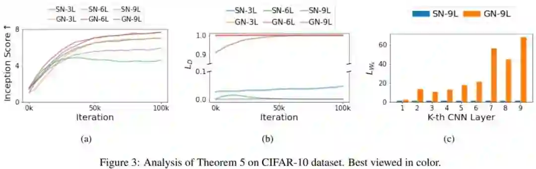 定理 5 的实验分析。因此,研究者设计了实验来测试具有 Wasserstein 损失的 SN 和 GN。下图 3a 和 3b 分别显示了关于 CIFAR-10 数据集上不同方法的训练迭代的判别器的初始分数和 Lipschitz 常数。下图 3c 显示了 CIFAR-10 数据集层级中 GN-9L 和 SN-9L 的 Lipschitz 常数。