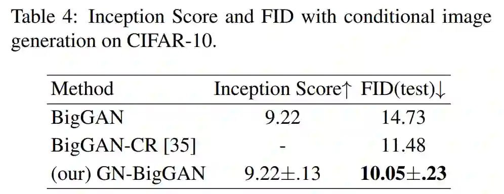 研究者进一步使用 BigGAN [1] 中提出的相同架构在 CIFAR10 数据集上进行实验。同样地,判别器中的 SN 被 GN 代替。下表 4 显示 GN 在 FID 方面可以进一步将 BigGAN 提升 31.8%。