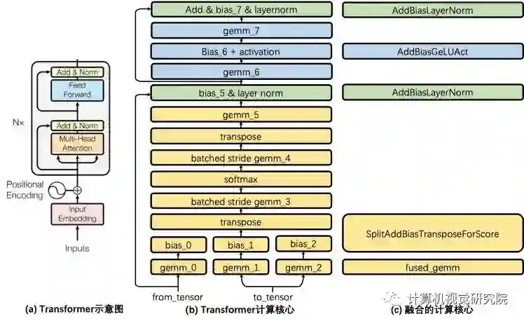 如下图所示,Transformer 架构中的 Transformer Cell 计算包含了 8 个 GEMM(通用矩阵乘法,General Matrix Multiplication)运算。其中,(a) 中灰色方框内的结构为一个 Transformer Cell,BERT encoder 堆叠了 Nx 个这样的 Transformer Cell;(b) 将一个 Cell 的细节加以展开,每一个矩形都是一个独立的计算核心。