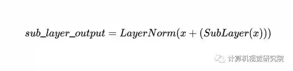 Encoder由N=6个相同的layer组成,layer指的就是上图左侧的单元,最左边有个“Nx”,这里是x6个。每个Layer由两个sub-layer组成,分别是multi-head self-attention mechanism和fully connected feed-forward network。其中每个sub-layer都加了residual connection和normalisation,因此可以将sub-layer的输出表示为: