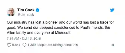 苹果 CEO Tim Cook 表示,科技行业失去了一位先驱,世界失去了一份正义的力量。