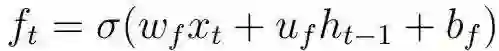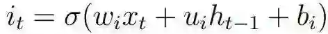 值得注意的是,LSTM 还包含遗忘门,即网络能够删除一些不必要的信息。总的来说, LSTM 的结构主要包含有:三个控制不同的门(输入门、遗忘门及输出门),以及存储单元状态。 输入门由当前输入 xt 和前一个状态 ht-1 控制,它的定义如下: