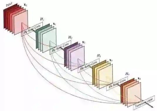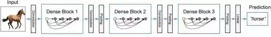 DenseNet 模型结构示意图。该模型由多个密集模块堆叠而成。