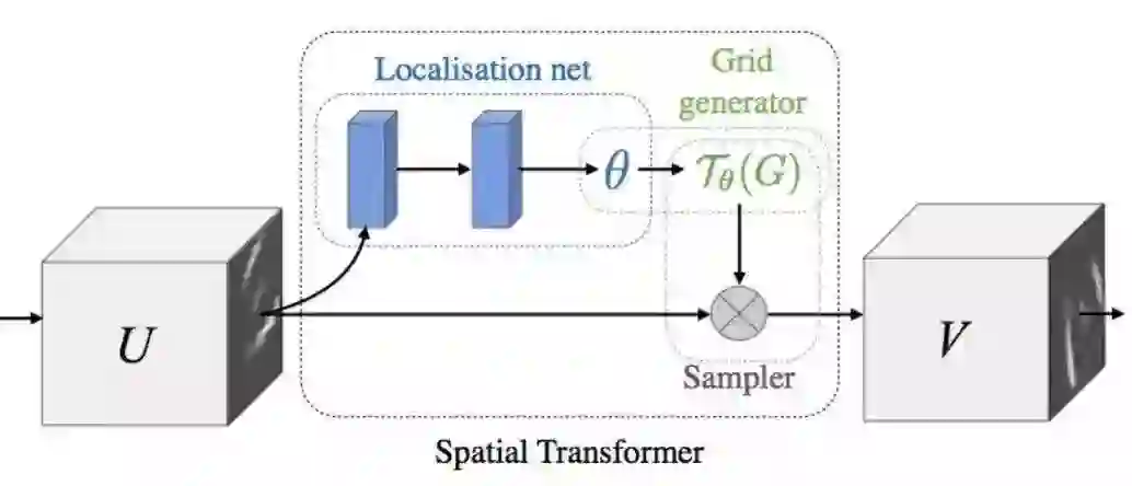 这些数据增强操作的主要优点是使得网络对于各种图像转换更加鲁棒,这项技术也是 AlexNet 取得成功的主要原因之一。因此,除了上述改变网络架构以简化训练的方法之外,其他的研究工作旨在引入新颖的模块结构来更好的训练模型。处理不变性最大化的一种优秀结构是空间变换网络(STN)。