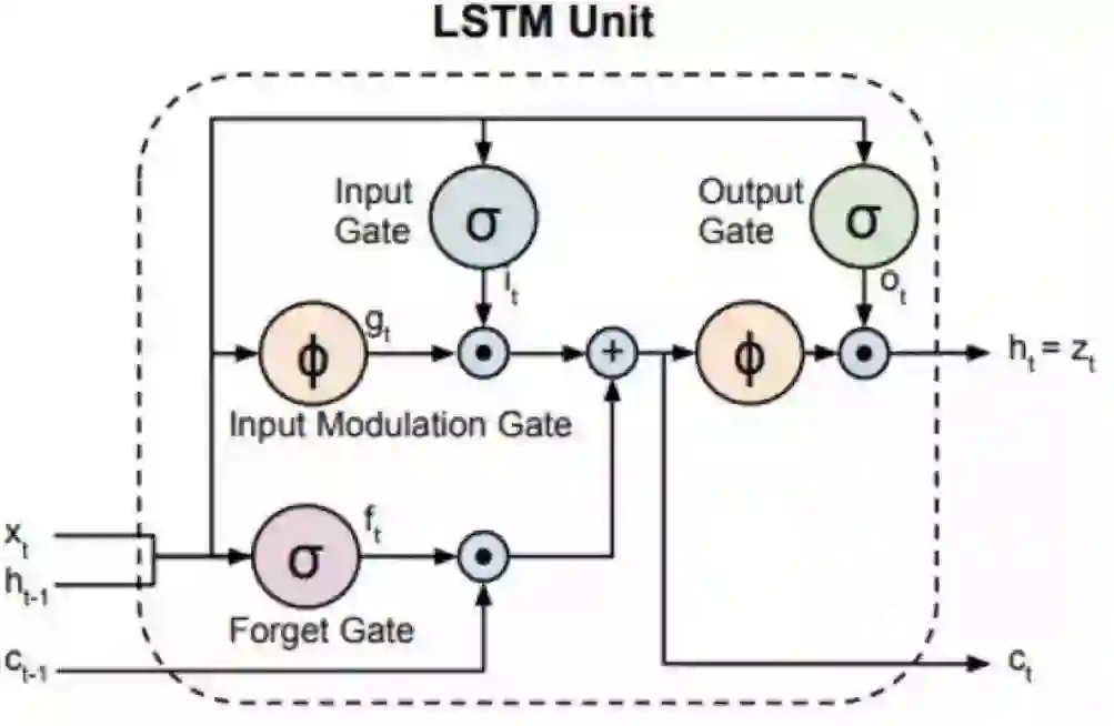 长短期记忆网络(LSTM)的结构示意图下图所示,拥有存储单元或记忆单元,随着时间的推移存储记忆信息。LSTM 的存储单元是通过门控机制从中读取信息或写入信息。