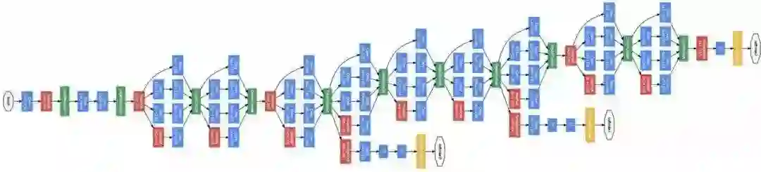 GoogleNet 模型结构示意图。该模型由多个 Inception 模块构成。