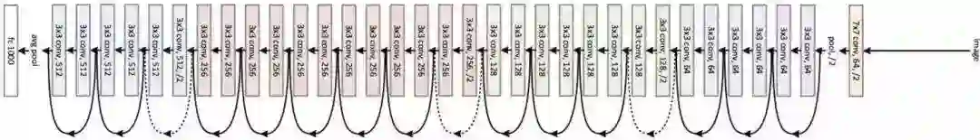 ResNet 模型结构示意图。该模型由多个残差模块构成。