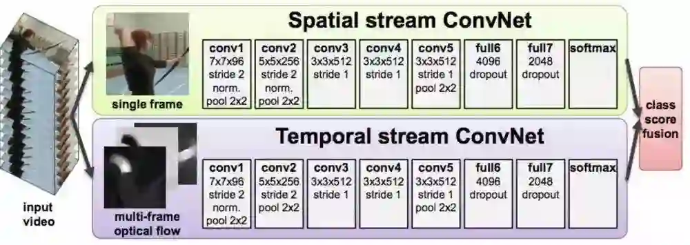 双流卷积神经网络。该模型以 RGB 光流数据作为输入。