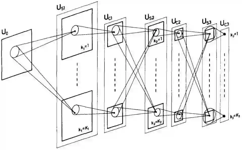 卷积神经网络的结构最早是受生物视觉机制启发而设计的,正如 Hube 在其开创性的研究中所描述的人类视觉皮层的工作原理。随后,Fukushima 提出的神经感知器(Neocognitron)是卷积神经网络的前身,它依赖局部连接的方式,由 K 层神经网络层级联而成,每层神经网络由 S-cell 单元,U sl 及复杂的单元相间分布而成,这种交替分布的形式是模仿生物简单细胞中的处理机制而设计的,其结构示意图如下图所示。