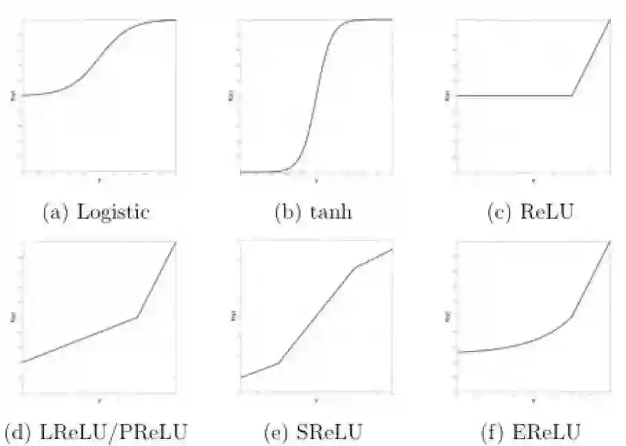 常用的非线性函数主要包括 Logistic 函数、tanh 函数、Sigmoid 函数、ReLU 及其变体 LReLU,SReLU,EReLU 等,其函数图像如下图所示。