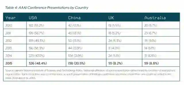 在论文发表数量上,2015年中国学者在AAAI上发表的论文为138项,占据全世界的20.5%;而来自美国学者发表的成果数量为326项,占全世界的48.4%。