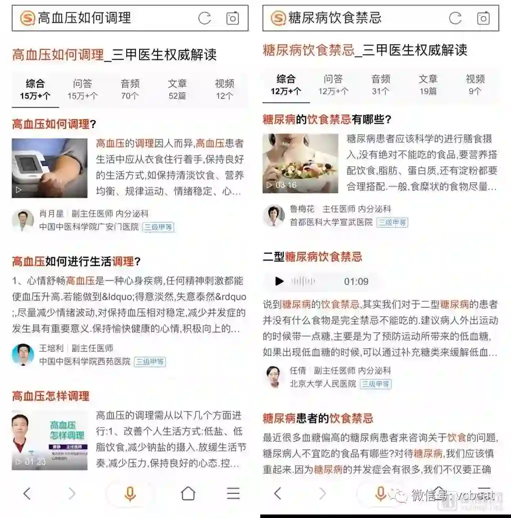 在医疗搜索领域逐渐深入的搜狗基于其搜索技术,近期推出“三甲医生权威解读”。用户在搜狗搜索中查询医学相关问题,比如用户在直接搜索类似“高血压如何调理”或“糖尿病饮食禁忌”这类问题,即可直接得到由全国三甲医院主任医生提供的权威、专业解读内容,涵盖音频、视频、文章、问答等多种形式。
