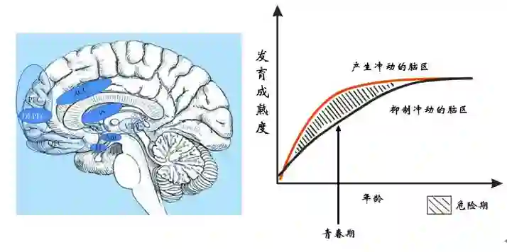 大脑中产生冲动和抑制冲动的脑区(左图)。青春期前后的一段时间内,产生冲动的脑区其发育成熟度要大于抑制冲动的脑区(右图)。处于这个年龄段的青少年往往难以控制冲动、冒险、反叛等行为,并忽视这些行为可能对自己带来的危险