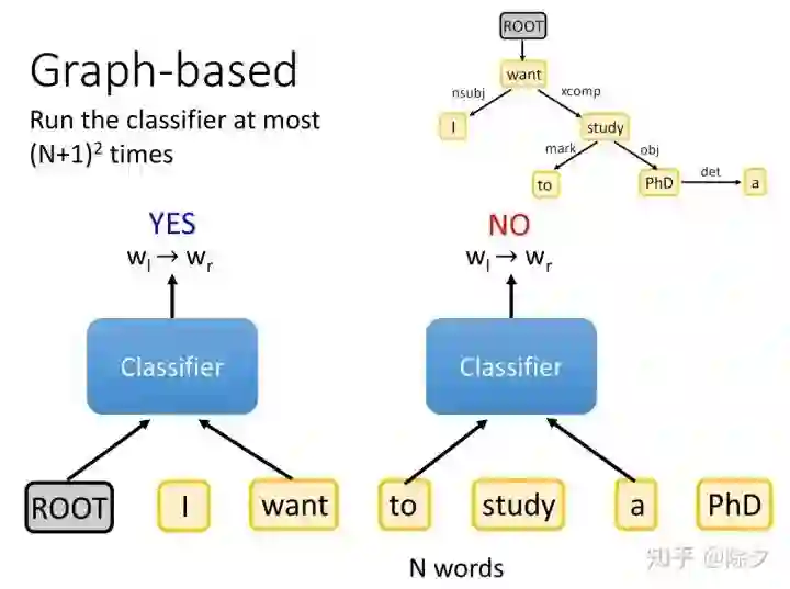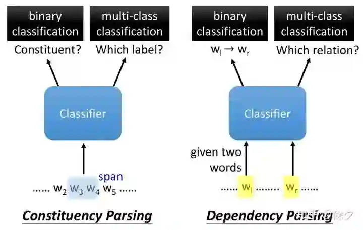 我们要怎样得到这样一棵依存解析树呢?实际上丢给分类器两个词汇和其上下文,它会先通过一个二分类器,用来输出左边到右边的token之间有无依存关系,若有依存关系,则第二个分类器会输出其关系的类别。
