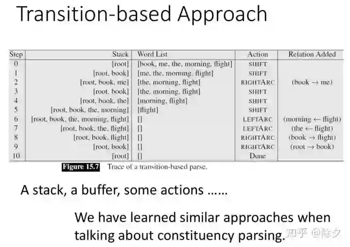 类似的,我们也可以用基于转移的方式来做依存解析。这部分可以参照上一期的 成分句法分析。模型要根据 Buffer 和 Stack 的内容,来决定要采取哪一个 action。