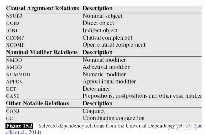 成分句法分析关心的是,某两个相邻词汇能不能接在一起构成成分(广义的mention)。而依存句法分析关系的是,两个词汇之间的关系(entity relation)。依存解析不关心两个词汇是否一定要相邻。比如 book 和 flight 没有直接相连,但是 flight 是 book 的宾语,book 是 flight 的主语。我们会用一个从 book 指向 flight 的箭头来表示这种依存关系。箭头的起始我们叫作 head。