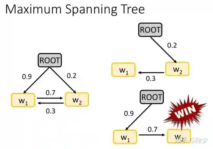 但如果我们把判断有无关系和判断关系是什么分开来处理,会容易出现矛盾的情况。比如 w1和w2之间有w1->w2的依存关系,而w2和w3又有w3->w2的依存关系。这样就会出现一个 token 入度是2的不可能情况。