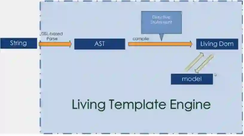 原理如下:活动模板融合了字符串模板和DOM模板的技术,模板字符串string通过自定义的解析器DSL-based Parse解析成AST(抽象语法树),通过遍历AST,使用createElement()、setAttribute()等原生DOM方法,生成DOM树,最终导致DOM树会与数据模型model进行绑定。由于其内部完全不使用innerHTML,所以安全性较高