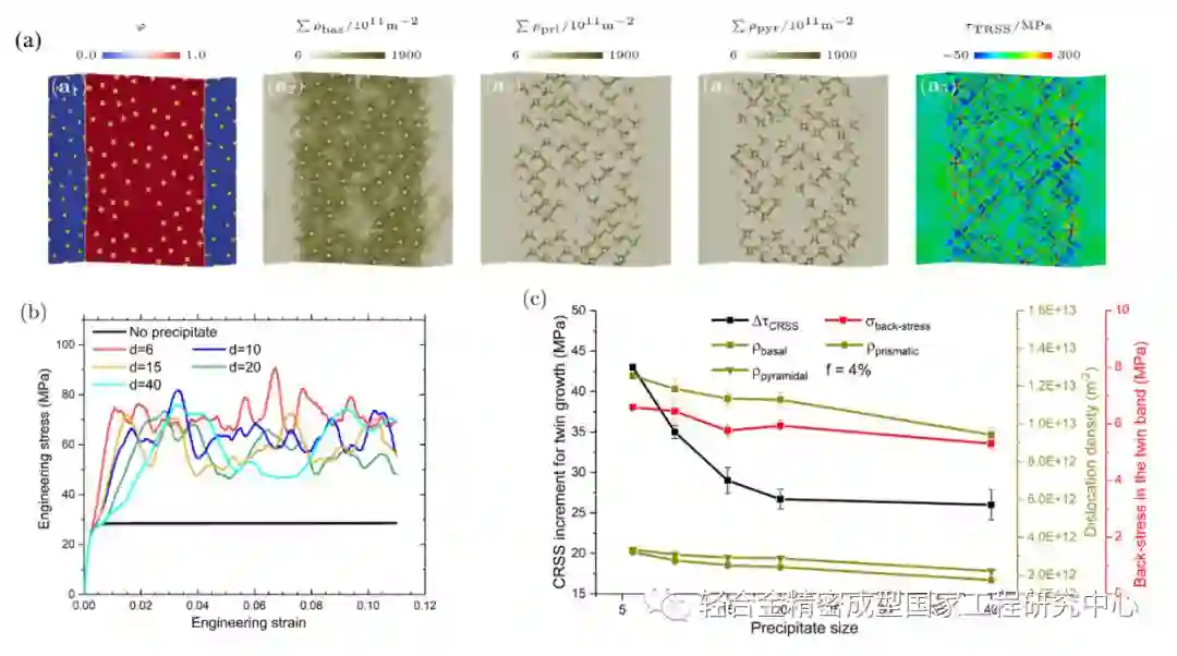 图 (a) 镁合金拉伸孪晶与第二相交互作用过程中孪晶形貌、基面、柱面和锥面位错以及孪晶面上剪切应力的分布规律;(b) 含不同尺寸球形第二相的单晶体的应力-应变仿真曲线;(c) 第二相尺寸对孪晶长大临界剪切应力、孪晶内部基面、柱面以及锥面位错密度以及背应力的影响规律