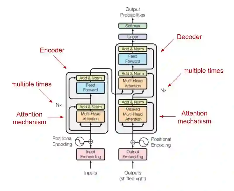 编码器利用字节对和位置嵌入处理输入,其中位置嵌入描述的是输入句子中“嵌入的单词”和“在何处嵌入”。相同的编码器将字节和位置嵌入转换为矢量编码,然后将该矢量编码输入解码器,解码器的任务是将编码转换为目标文本序列。 该输出和来自前一步骤的编码被馈送到下一个编码- 解码步骤,并且重复多次,以产生更好的文本序列。