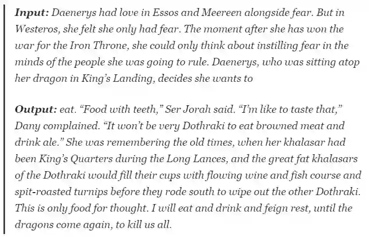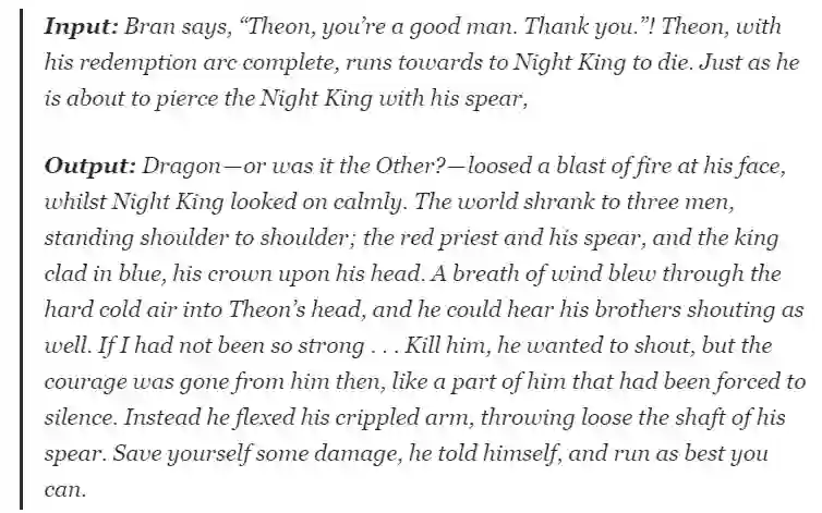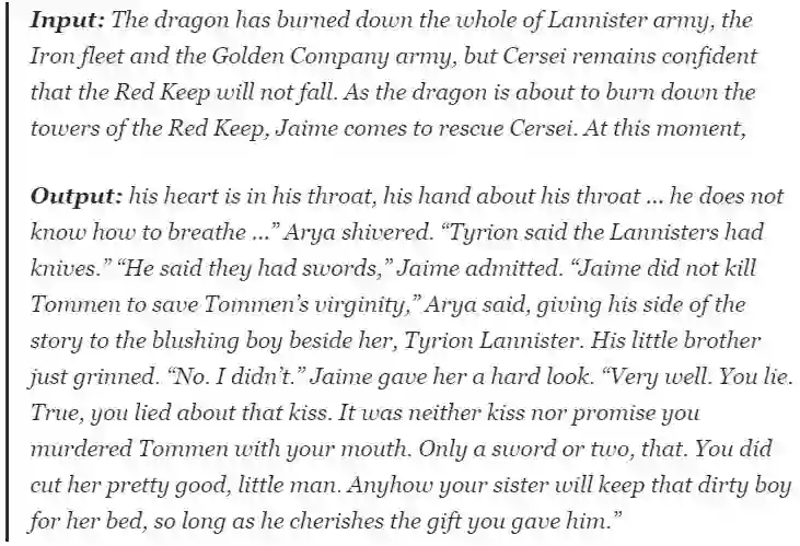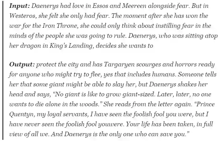 随后,作者便用年初 OpenAI 提出的 GPT-2 文本生成模型实践操作了一波。模型学习的是《冰与火之歌》(A Song of Ice and Fire)原著,输出三大反派人物(the Night King, Cersei Lannister and Daenerys Targaryen)的结局。