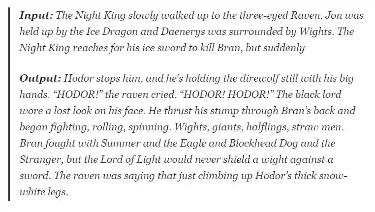 根据 GPT-2,Hodor还活着并赶来救营 Bran,这真是一个转折点! 或者可能是 Hodor的灵魂进入了 Bran 的身体。不过之后,也不知道这个模型想说些什么。。。