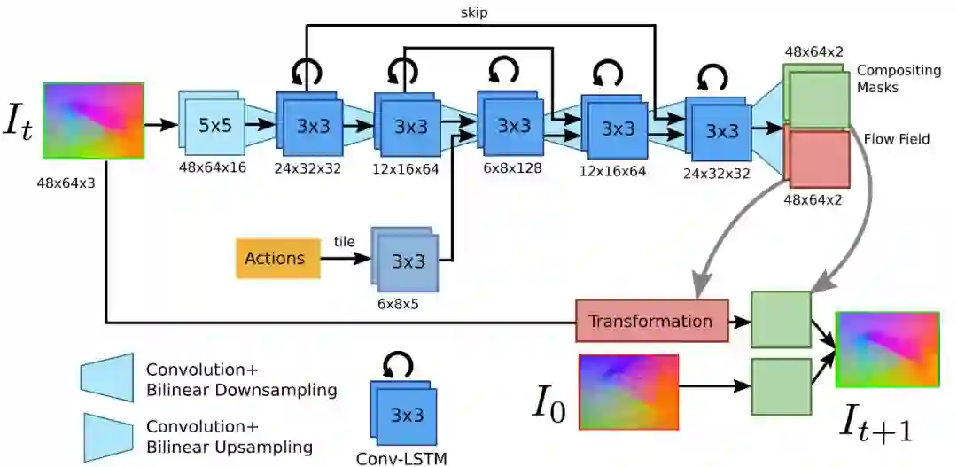 触觉 MPC 算法的工作原理是在自主采集的数据上训练一个动作条件的视觉动态或视频预测模型。该模型从原始的感官数据 (如图像像素) 中学习,并且能够直接对未来图像进行预测,并将其作为输入,作为机器人未来采取的假设动作以及我们称为上下文帧的起始触觉图像。没有指定其他信息,例如末端执行器的绝对位置。