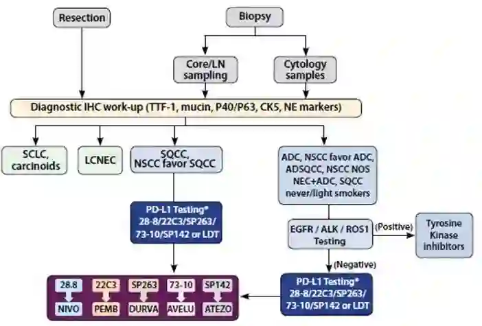 当前建议的任何治疗和生物标志物检测法则(图3)都可能由于该领域的迅速进展而快速过时。最近使PD-L1检测发挥重要作用的是帕姆单抗,获批用于PD-L1 TPS≥50%并且无EGFR突变和ALK重排的一线治疗。然而,在EGFR、ALK或者ROS1异常的患者中,决定PD-L1状态可能并不是必须的,除非已经用尽可选的靶向治疗,这类人群主要使用各自TKIs。病理医生可能希望在有这些异常的患者中推迟PD-L1检测,直到肿瘤科医生提出检测的需求。但是这种策略有潜在风险,因为当提出这项检测需求时,因为可能存放的白片已不适合进行PD-L1染色,或者组织蜡块由于EGFR检测而耗尽。