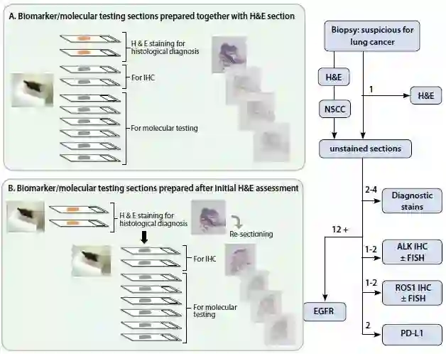 图2. 分子检测最大化利用组织的策略 :准备为分子检测的IHC白片可能在初始的HE染色评估之前(A)或者之后(B)。准备白片数量取决于病理科的策略,为最佳的组织使用和对初始诊断和生物标志物检测结果的最短周转时间