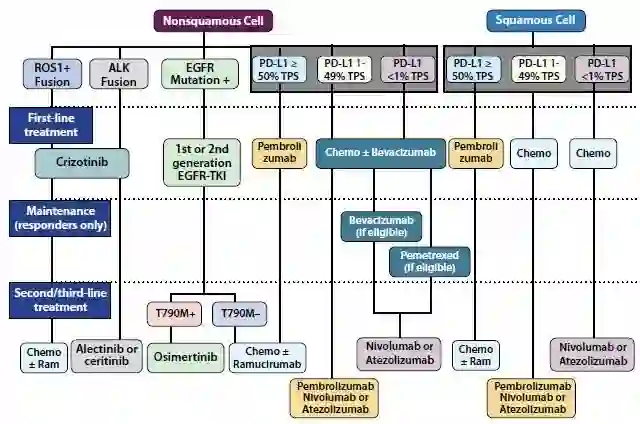 对于不存在EGFR、ALK或者ROS1异常的患者和既往已接受过一线或二线治疗的患者,只有帕姆单抗需要决定PD-L1表达(使用1%为域值)来限制治疗。但根据全球来看,PD-L1检测可能被肿瘤医生使用于纳武单抗治疗非鳞癌非小细胞肺癌的知情同意。一旦正在进行的5种抗PD-1/PD-L1药物的各项临床II期和III期试验得到结果,将来我们可能见证PD-L1检测法则更多的改变