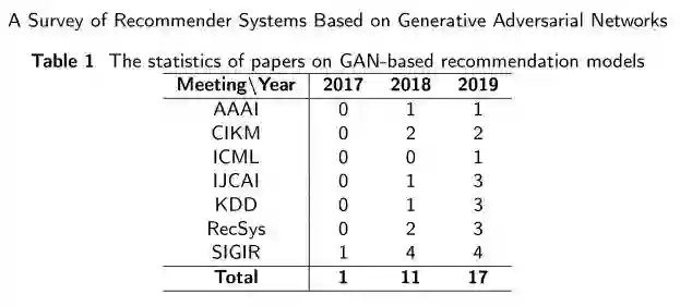 GANs在其他领域的成功应用为RS树立了良好的榜样,一些开创性的工作已经在这一领域迈出了第一步[82]。根据近三年与RS相关的顶级会议的统计,基于GAN的推荐模型的论文数量逐年增加,如表1所示。在2018年基于GANs的信息检索(IR)模型研讨会上, 研究人员[95]指出基于GAN的RS将成为一个热点领域的RS。原因在于,GANs的想法带来了新的机会抵抗噪声数据的干扰和缓解数据稀疏。在现有的基于GAN的RS中,为了减少RS对数据的干扰,一些研究人员验证了加入对抗扰动的有效性,并在目标函数中引入极小极大对策来减少数据噪声。与此同时,其他研究人员试图使用鉴别器以一种对抗性的方式从未观察到的例子中区分出信息更丰富的样本。为了缓解数据稀疏性问题,现有的基于GANs的推荐模型不仅可以通过增加user-item交互信息直接生成用户偏好,还可以通过增加辅助信息合成用户偏好,可以显著降低数据稀疏性。