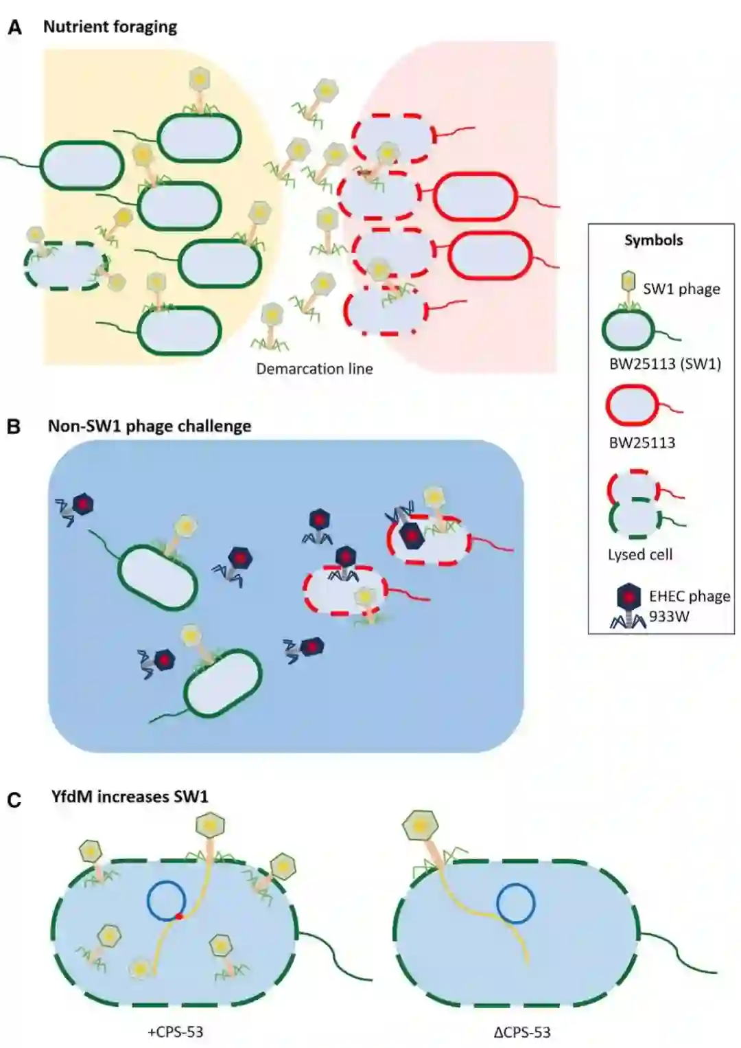 对边界线处的群体进行研究发现,在长期的进化过程,一个类似于T1的噬菌体(重新命名为SW1)被细菌捕获,将其基因组整合到了细菌基因组上。在运动平板上,当携带SW1噬菌体的大肠杆菌与不携带SW1噬菌体的大肠杆菌相遇时,一部分细菌中SW1噬菌体会重新被激活,重新释放到环境中,去攻击不带有此噬菌体的细胞(外族,没有标记“SW1”)并杀死这些细胞,从而在“交战区”形成了没有活细菌而存在大量活跃的SW1的透明区,也就是平板上看到的分界线(demarcation line)(图2A)。