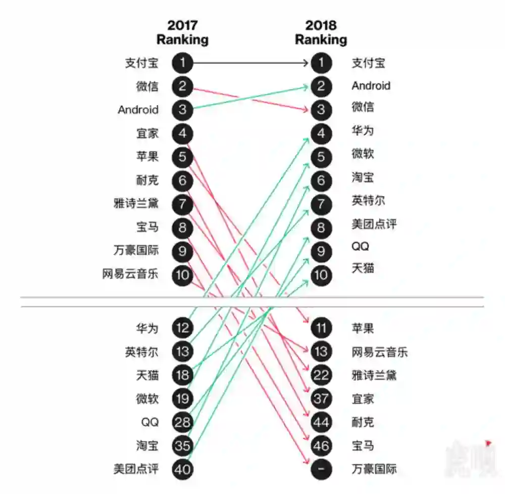 在上榜的50个品牌中,30个为中国本土品牌,其中排名第一的是支付宝。