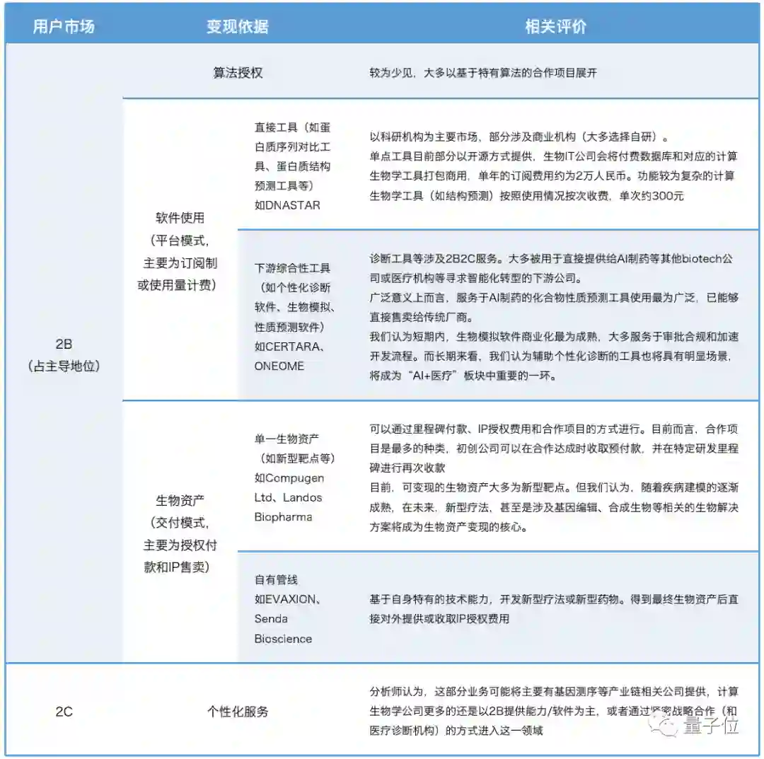 目前,计算生物行业同时涉及2B和2C的商业模式,主要为算法授权、生物资产和软件使用。我国目前主要为前两种。