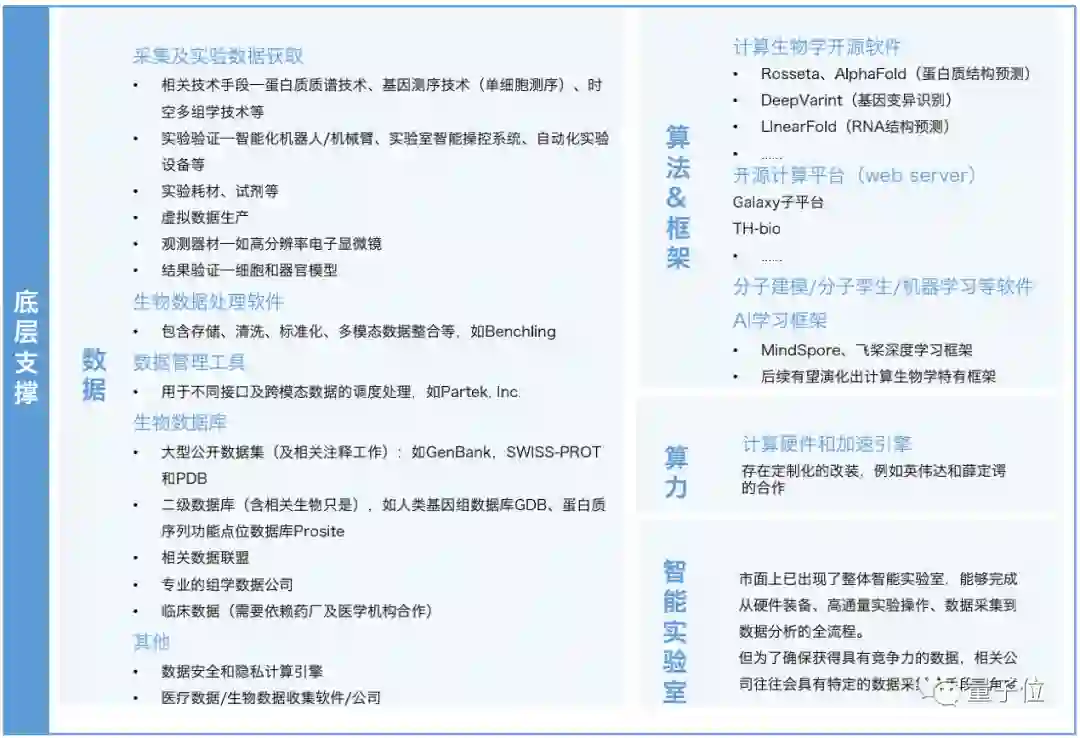 在底层支撑中,生物数据及算法框架成为两大关键。