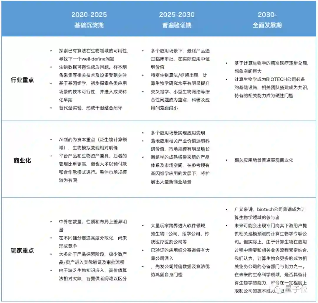 以最终落地应用和商业化为核心导向,我们将计算生物学的发展阶段分为三部分: