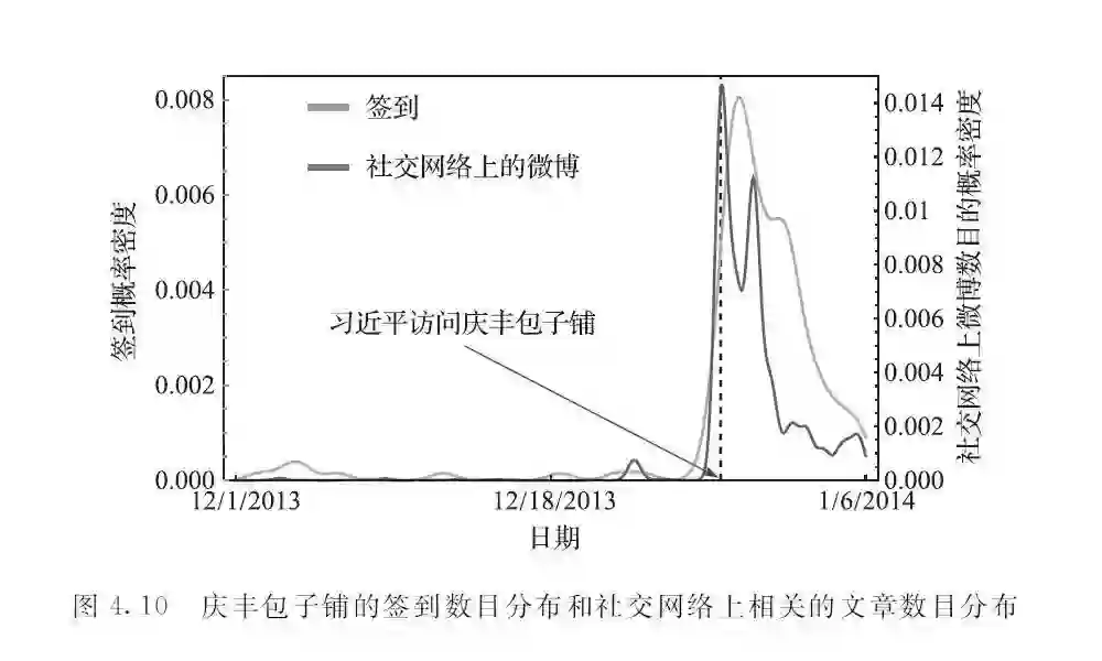 在大数据时代,移动数据的普遍收集在很大程度上能够刻画用户的各种消费行为,比如在餐厅的签到数据表明了用户就餐的消费行为,在商场连接Wi-Fi的数据蕴含了用户购物的消费行为;与此同时,社交网络的快速发展也逐渐对用户的消费行为产生越来越重要的影响,一方面社交网络中朋友对某件商品的讨论或者口口相传可能会成为冲动购物的刺激因素,另一方面,越来越多的品牌店甚至个体卖家利用社交网络作为越来越重要的市场营销平台。因此,把两者关联起来,就能够通过数据驱动的方式来计算消费冲动心理,使得消费冲动心理的测量能够被大规模的采用。如图4.10所示的例子,在国家主席习近平就餐庆丰包子铺的事件后,社交网络上出现了大量的相关信息,而随后有大量的用户在该店铺留下了签到数据。签到数据和社交网络上相关信息的强关联性表明了很多用户很可能是受到社交网络上信息的刺激才去消费的。