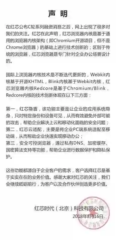 昨日,红芯方面也回应了质疑,据中国网报道,红芯联合创始人高婧回应,红芯浏览器“包含‘Chrome’在里面”,但并非抄袭,而是“站在巨人的肩膀上去做创新”,如智能感知渲染引擎及应用安全方面都有创新,这些功能需连接云服务,“单看安装包是看不到任何东西的”。她还称,客户满意度很高,“绝不是那些人说的拿国产概念去骗钱”。