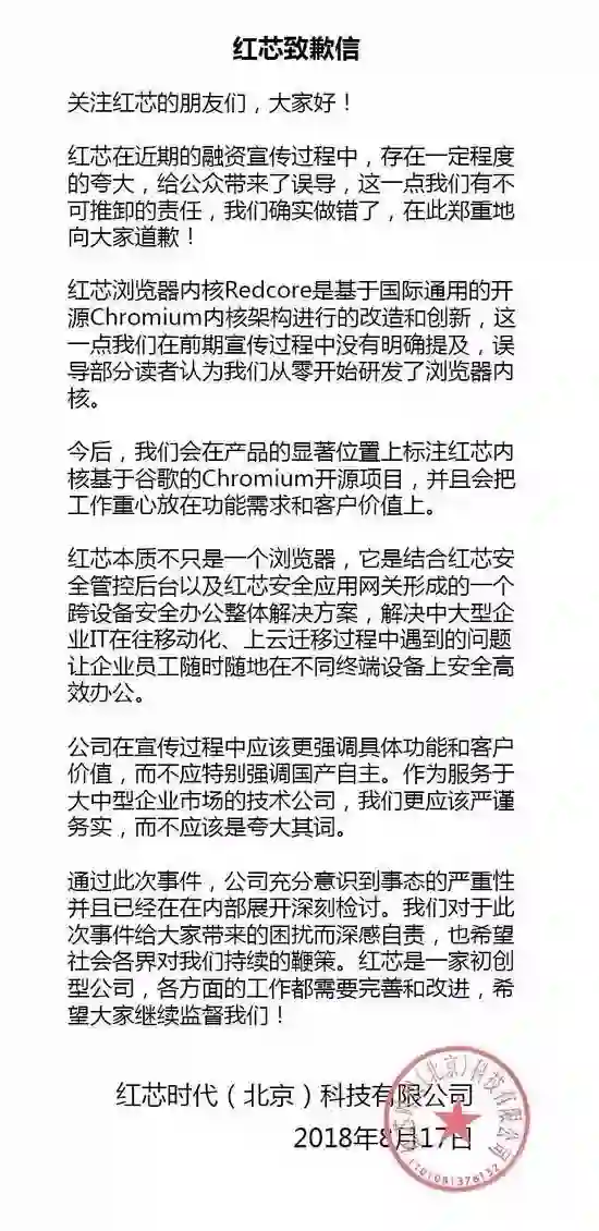 而程序员出身的公司创始人兼CEO陈本峰向《财经》杂志表示,红芯浏览器确实是基于谷歌Chrome浏览器内核而开发,但他强调,红芯在内核层面有自主创新,以适用于中国企业用户的办公上网需求。