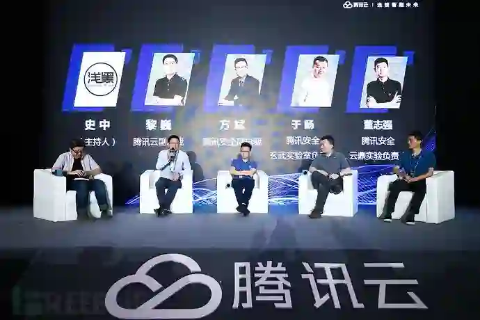 终于到了大家喜闻乐见的侃大山时间,主持人是浅黑科技创始人史中,嘉宾分别是腾讯云副总裁黎巍、腾讯安全副总裁方斌、腾讯安全玄武实验室负责人于旸(TK)和腾讯安全云鼎实验室负责人董志强(Killer)。