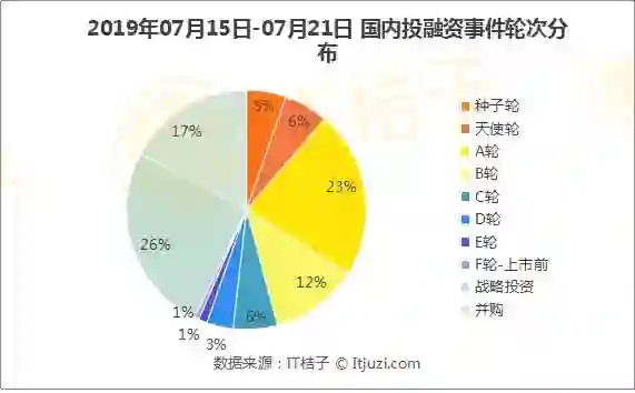 从轮次分布来看,本周战略投资事件占比较大,分别发生 43 起,占比 26%;其次,A轮投资排列第二,发生 38 起,占比 23%;并购事件排列第三,发生 29起,占比 17%。