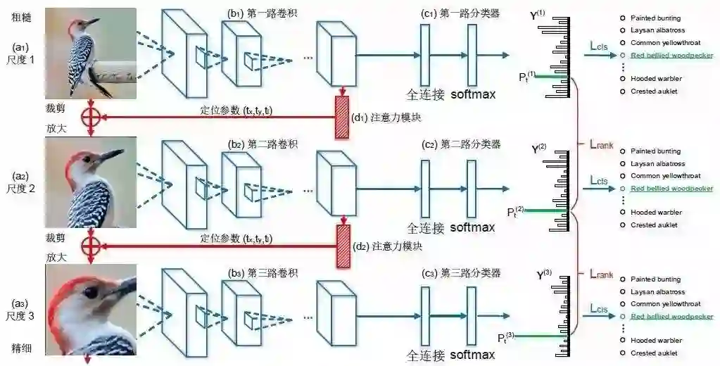 只需输入一张图片,“RA-CNN”便可自动找到不同尺度下的有判别力区域:上图中蓝色部分是分类子网络,它们将多个尺度的图片用相应的卷积层提取出特征后送入softmax 分类器,再以类别标签作为监督对卷积层和分类器参数进行优化,当最终分类时,将各个尺度的特征拼接起来,用全连接层将信息充分融合后进行分类。