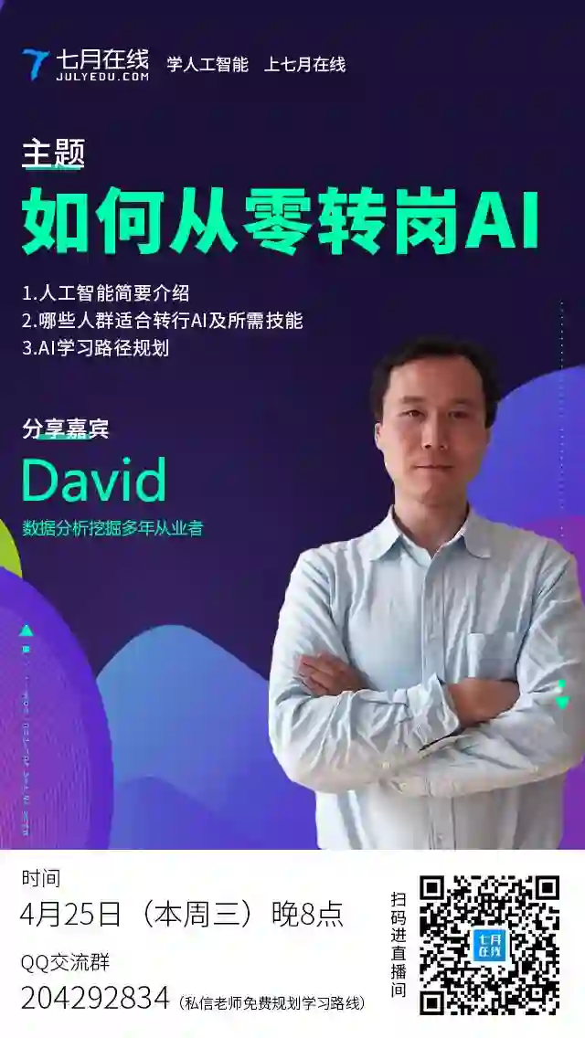 今晚(4月25日)8点,七月在线公开课【如何从零转岗AI】,点击文末“阅读原文”进入直播间。