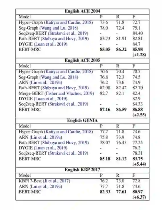 我们首先在Nested NER上做实验,数据集(英文)用ACE2004,ACE2005,GENIA,KBP2017。