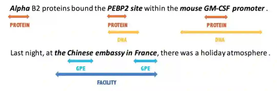 如下图所示的两个例子所示。如此一来,以往针对Flat NER的模型就不对Nested NER起效,这是因为它们大多数是序列标注模型,这就没有办法直接迁移到Nested NER上。