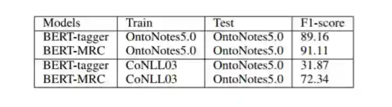 上面我们说到,MRC的问题由于编码了一些先验信息,所以可能在标签迁移上效果较好,下表是结果。可以看到,在两个数据集迁移上,tagger都远差于MRC。