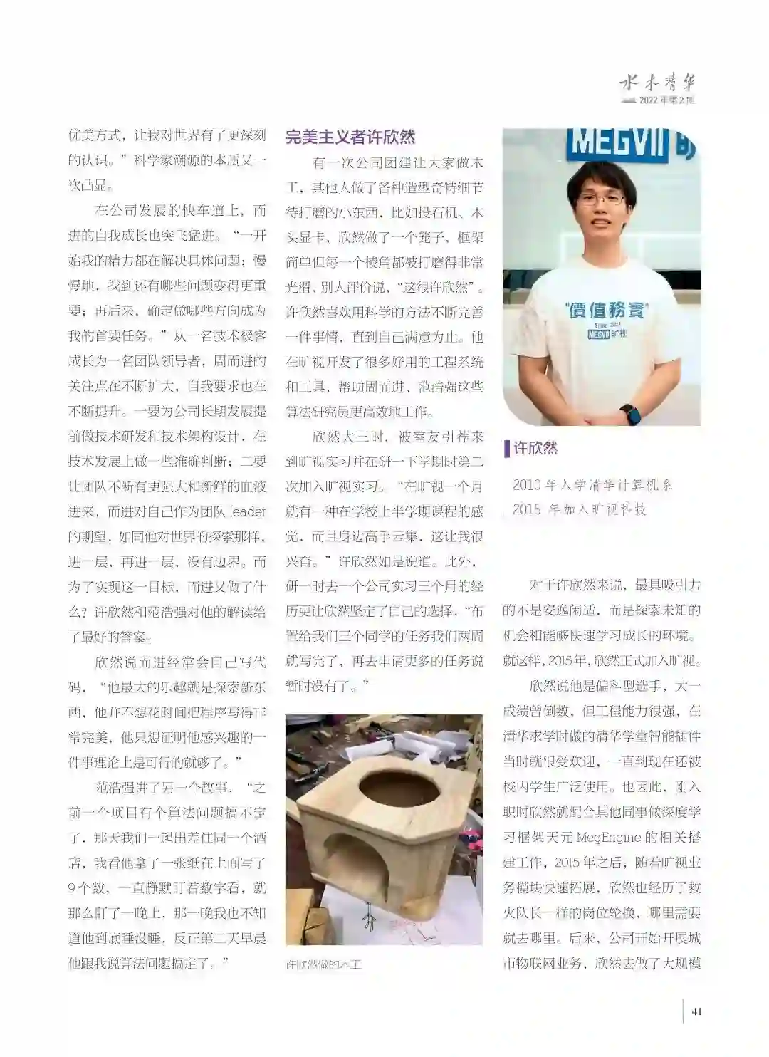 有一次公司团建让大家做木工,其他人做了各种造型奇特细节待打磨的小东西,比如投石机、木头显卡,欣然做了一个笼子,框架简单但每一个棱角都被打磨得非常光滑,别人评价说,“这很许欣然”。许欣然喜欢用科学的方法不断完善一件事情,直到自己满意为止。他在旷视开发了很多好用的工程系统和工具,帮助周而进、范浩强这些算法研究员更高效地工作。