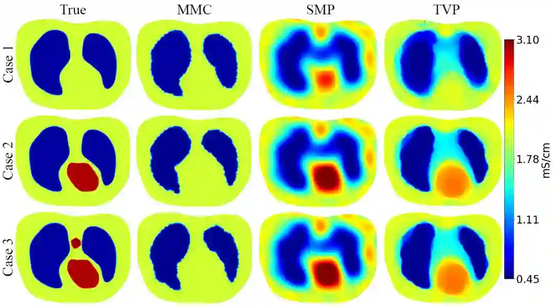 图:肺部电阻抗成像。Ture: 真实电导率分布;MMC:自主开发算法成像结果;SMP与TVP:传统算法成像结果。
