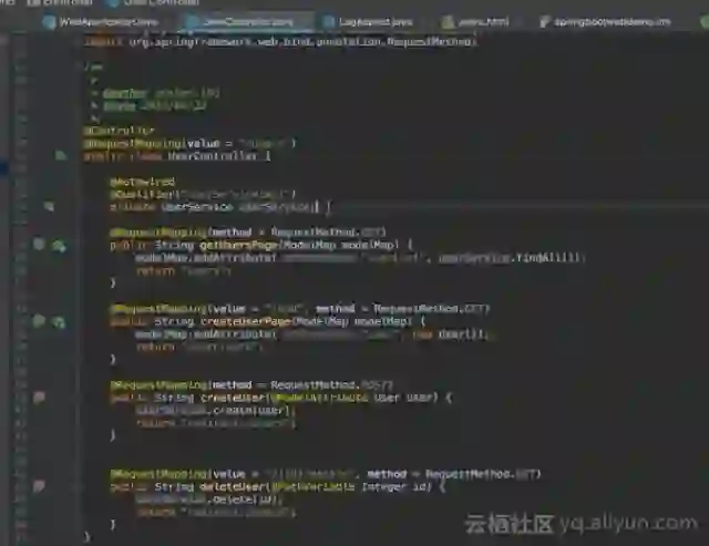 如下图所示的是UserController类,在其上面可以看到@Controller的注解,因为这个注解,UserController的信息将被注入到IOC容器中。在UserController中可以看到UserService的一个成员变量,这个成员变量在整个UserController并没有得到初始化。因为有一个@Autowired注解,这个UserController就可以在初始化之后会产生由于@Autowired注解声明的依赖,这个依赖将由IOC容器负责注入。其所注入的是UserService接口的实现。