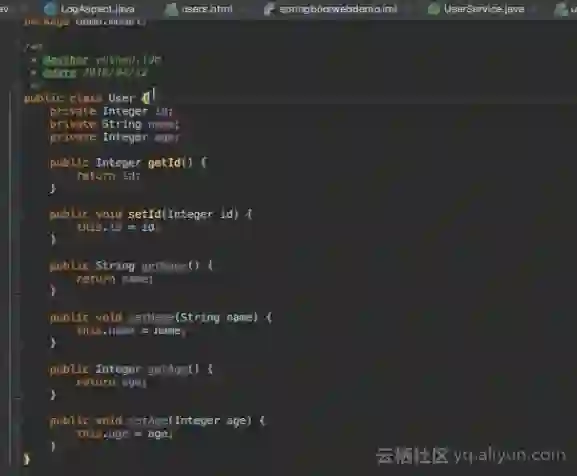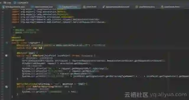 在aop包下的LogAspect类里面可以看到面向切面的编程思想。首先在log()函数之前可以看到一个名为@Pointcut的注解,因为这个注解,这个log()函数将代表一个切点,同时可以看到在@Pointcut注解里面有一个表达式,该表达式标明了切点的位置,其将把demo.controller包下面的所有类以及所有公开的方法都作为切点进行切面编程。在doBefore()方法上面有一个函数注解,该注解就定义了一个切面,该切面位于切点之前,也就是在执行切点之前需要执行这段代码。同时还有一个切面是位于函数执行之后,将打印函数返回值输出的代码。